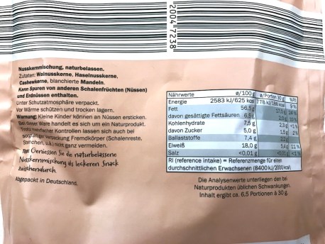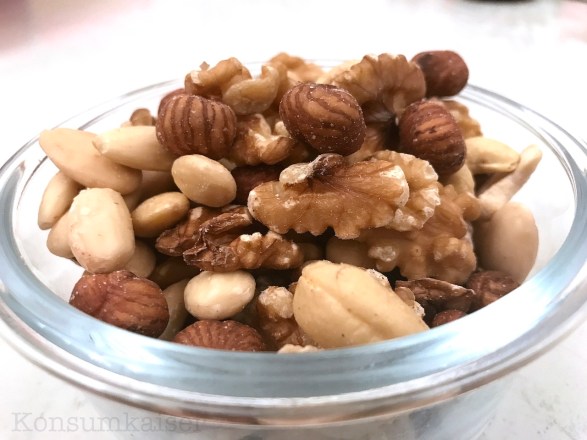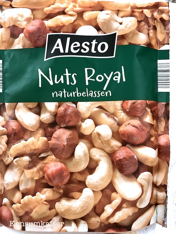 -Wenn ich es mir ganz besonders leicht machen möchte, greife ich auf eine Nussmischung zurück. Bei LIDL gibt es zB. die hier gezeigte Mischung für ca. 2-3 Euro.