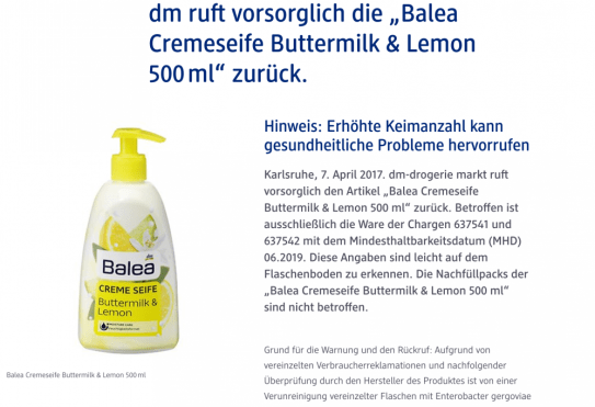 Der DM-Drogeriemarkt ruft vorsorglich den Artikel „Balea Cremeseife Buttermilk & Lemon 500 ml“ zurück. Betroffen ist ausschließlich die Ware der Chargen 637541 und 637542 mit dem Mindesthaltbarkeitsdatum (MHD) 06.2019. Diese Angaben sind leicht auf dem Flaschenboden zu erkennen. Die Nachfüllpacks der „Balea Cremeseife Buttermilk & Lemon 500 ml“ sind nicht betroffen.