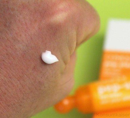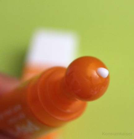 Die Tube schützt prima vor Licht und Luft, doch der Applikator wirkt billig und ein bisschen gestrig. Ich gebe ein bisschen auf den Finger und nutze nicht diesen Plastikball zum Verteilen. Clinique hofft durch diesen Applikator Schwellungen bekämpfen zu können. Nun ja, wäre er aus Metall, könnte eine gewisse Kühle gut helfen. So ist es nur ein nerviger Plastikball, mit dem möchte man nicht unbedingt die Augenzone massieren. Der kleine „Ball“ beinhaltet auch die Öffnung. Man muss ihn etwas aus dem Hals ziehen und dann auf die Tube drücken! Das erschliesst sich nicht unbedingt auf die erste Sekunde. Tricky!