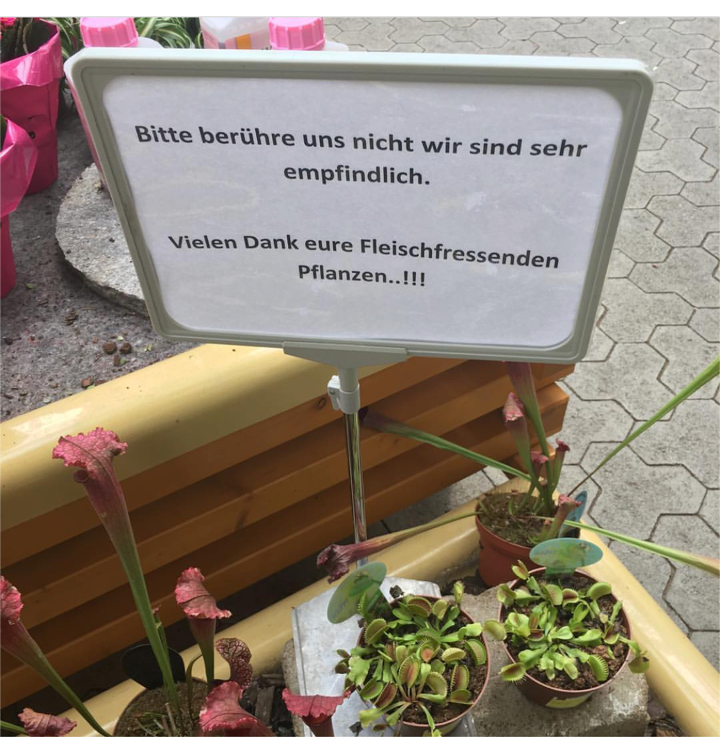 Huch, und schreiben können die auch? Auf der Rückseite des Schildes war noch ein großer Pfeil zur Pflanze hin abgebildet mit der Unterschrift: „Fette Beute bitte hier entlang!“