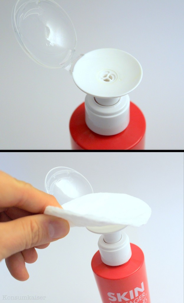 Man „entriegelt“ den Mechanismus mit einer Drehung des gesamten Kopfes nach Links, öffnet die transparente Kappe und drückt vorsichtig ein Wattepad auf die flache Fläche. Zwei- bis dreimaliges Pumpen durchnässt das Pad ausreichend. Trotzdem wird es nun nervig, denn wenn man vor dem Verschliessen des Pumpmechanismus nicht erst „verriegelt“ (Drehung nach rechts) läuft einem ein weiterer Schwall Flüssigkeit über die Finger. Legt man die Flasche hin, so läuft sie unter diesen Umständen gleich ganz aus! Einen Deckel zum Zuschrauben gabs wohl nicht mehr? Manchmal ist einfach einfach besser!