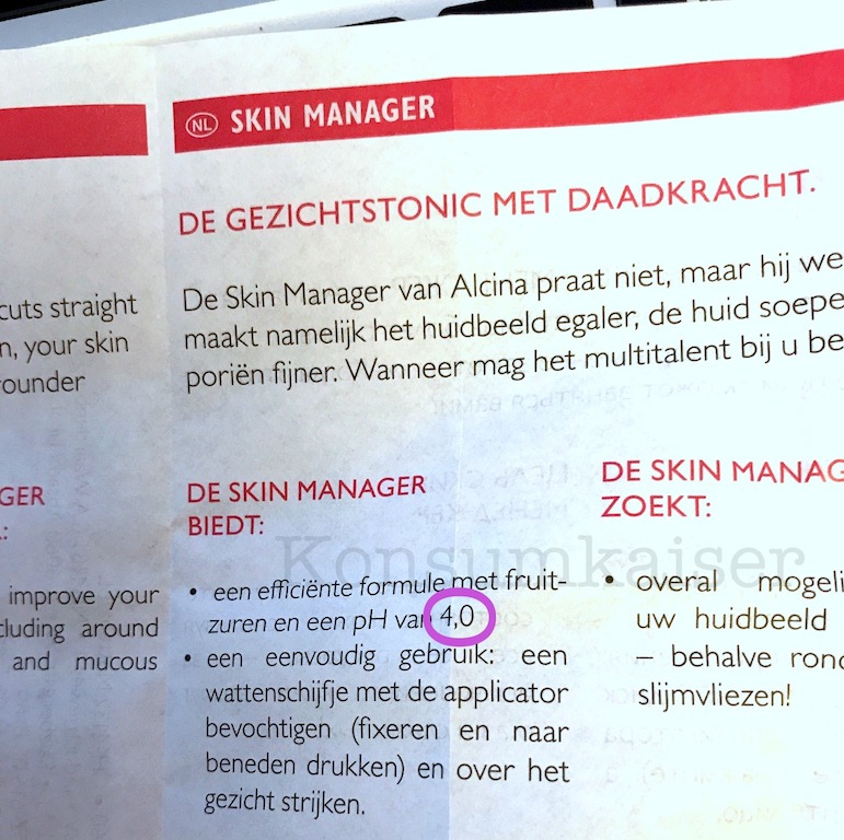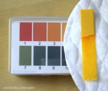 Leider ist der pH-Wert nicht so ganz toll. Er scheint ganz knapp unter 4 zu liegen, oder eben auch genau bei 4, das können die einfachen pH Teststreifen nicht so akkurat ermitteln. Aber ich habe im Produktleaflet ein Angabe dazu in der holländischen Beschreibung gefunden: (NUR) dort gibt Alcina den pH-Wert mit 4 an! Das würde die Wirksamkeit des Peelings deutlich schmälern.