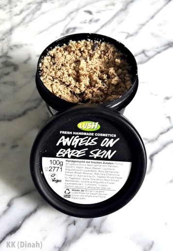 Streng genommen ist diese bröselige Masse auf der Basis von gemahlenen Mandeln und Glycerin kein Peeling, sondern ein Reiniger, der täglich verwendet werden kann. Er entfernt jedoch sehr sanft tote Hautschüppchen, deshalb fällt er für mich in diese Kategorie. Außerdem ist die Reinigungswirkung bei Make-up sehr mäßig, da muss frau schon nachreinigen. Mir gefällt, dass „Angels on Bare Skin“ die Haut nicht austrocknet. Die bröselige Konsistenz nervt mich, vor allem aber mag ich den intensiven Geruch des ätherischen Lavendelöls nicht, das bei sensibler Haut reizend wirken kann.