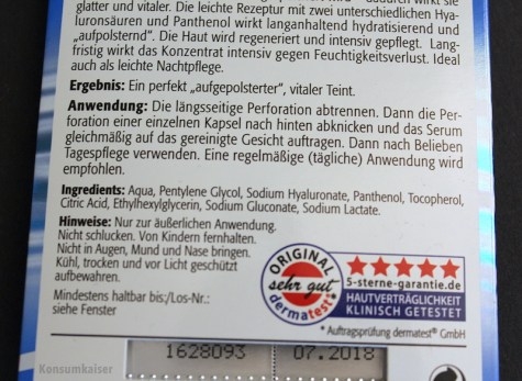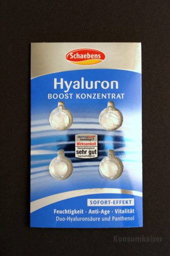 Eine recht gute Alternative möchte ich dazu noch empfehlen, die praktischer und etwas anders formuliert ist: Schaebens „Hyaluron Booster Konzentrat“. 4 x 0,4 ml kosten ca. € 1,99 (in Drogeriemärkten und Kaufhäusern)