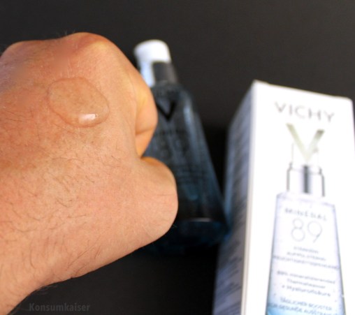 Die sehr reduzierte Formel hat aber auch Vorteile: Das Risiko für Allergien und Unverträglichkeiten sinkt drastisch, je weniger Inhaltsstoffe im Produkt sind, ganz einfach. Und oh Wunder, man denke daran, dass Vichy eine L´Oreal-Tochter ist, es sind keine Silikone und kein Alkohol enthalten. Pluspunkt! Also empfehlenswert auch bei empfindlicherer Haut. Da es ja ein „Booster“ ist, geht das mit den wenigen Inhaltsstoffen auch klar, aber ein paar mehr Inhaltsstoffe (zB. Vitamine) währen schon schön gewesen.