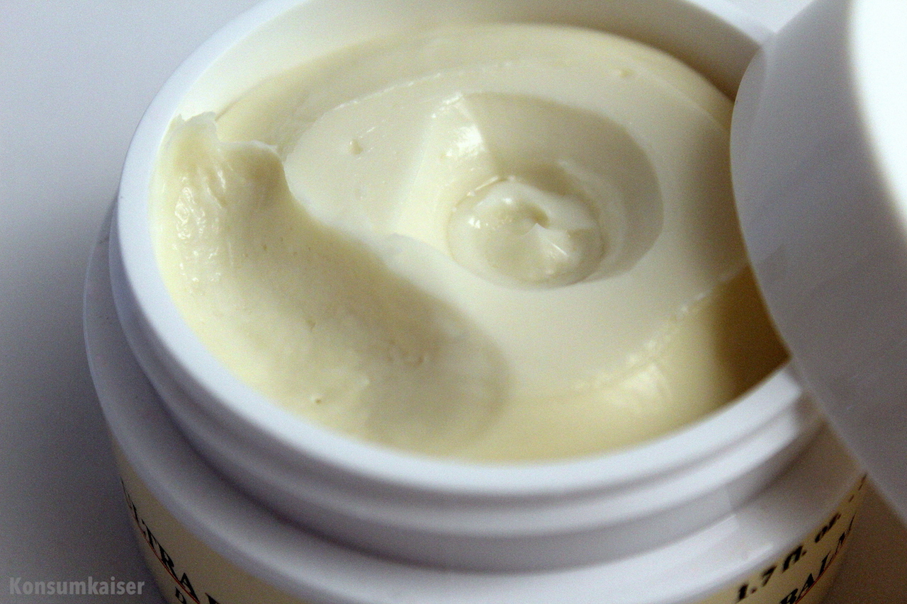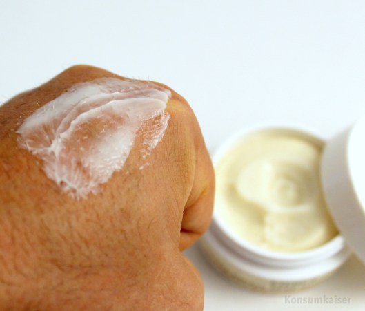 Wie man auf den Bildern schon ein wenig erkennen kann, ist der Balm recht pastös, also fester als eine gewöhnliche Creme. Man muss ihn zwischen den Handflächen erwärmen und verreiben, dann lässt er sich recht gut auftragen. Das bedeutet nicht, dass er sofort einzieht, das dauert ein wenig länger als bei den üblichen Cremes.