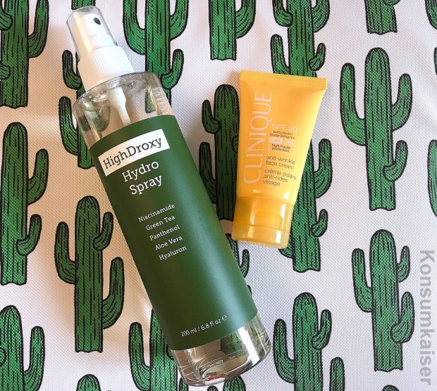 Macht sich hervorragend, ich liebe es: Zuerst wird die Haut mit dem HighDroxy „Hydro Spray“ eingesprüht. Die aktiven Inhaltsstoffe, wie zB. Antioxidantien, Niacinamid und beruhigendes Panthenol schützen die Haut in der Sonne ganz besonders und spenden vorsorglich viel Feuchtigkeit. Der eigentliche UV Schutz wird durch solche Produkte also sozusagen „geboostet“. Man kann dadurch zwar nicht noch länger in der Sonne bleiben, aber mögliche Zellschäden werden etwas minimiert. Auch unter der After-sun Creme eine gute Idee! Oder alleine, wenn man nach der Besonnung stark schwitzt. Ab 5 ml ca. 2,90 Euro