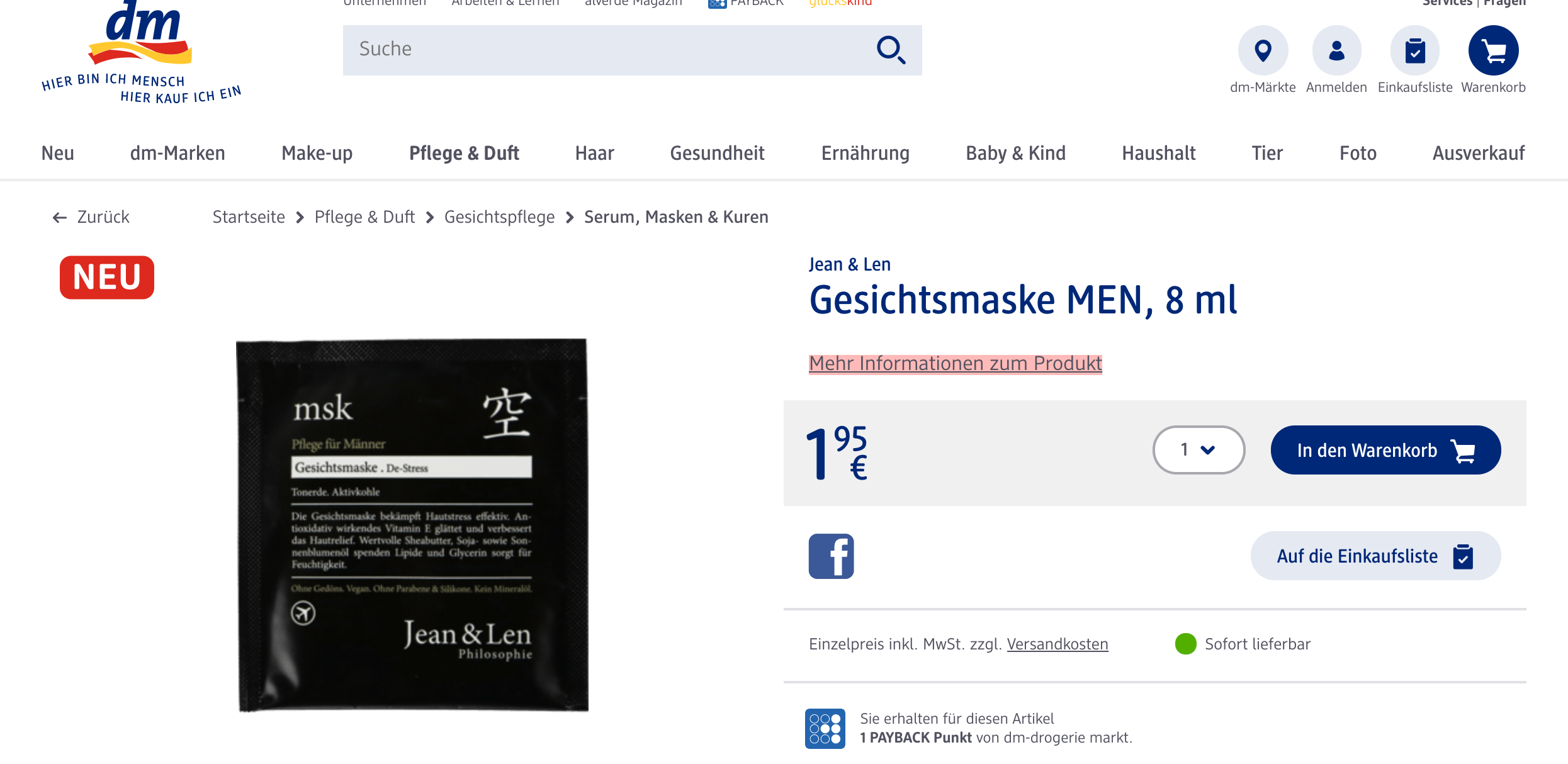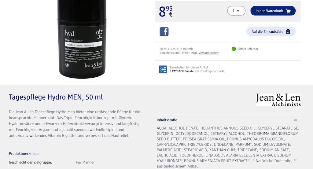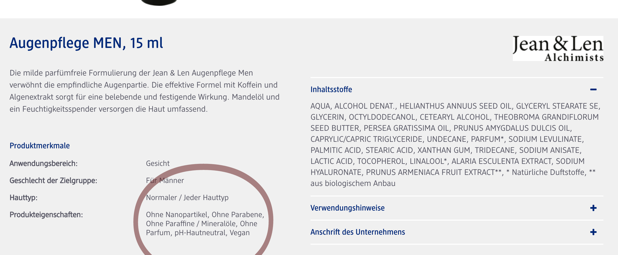 Die Marke „Jean & Len“ fällt mir schon seit einiger Zeit unangenehm auf. Nun verkorksen sie auch noch Männerpflegeprodukte! Eine Augenpflege (!) mit Alkohol denat. an 2. Stelle der Inhaltsstoffe ist wirklich frech! Dazu finden sich Parfüm (im Mittelfeld) und extra deklarationspflichtige Duftstoffe. Und das, obwohl DM das Produkt als „ohne Parfüm“ ausweist. Nochmals frech! Aber hey, die sind bestimmt total gut für die Haut, denn es sind „natürliche Duftstoffe“, und die stammen aus Bio-Anbau. Ich breche…zusammen.