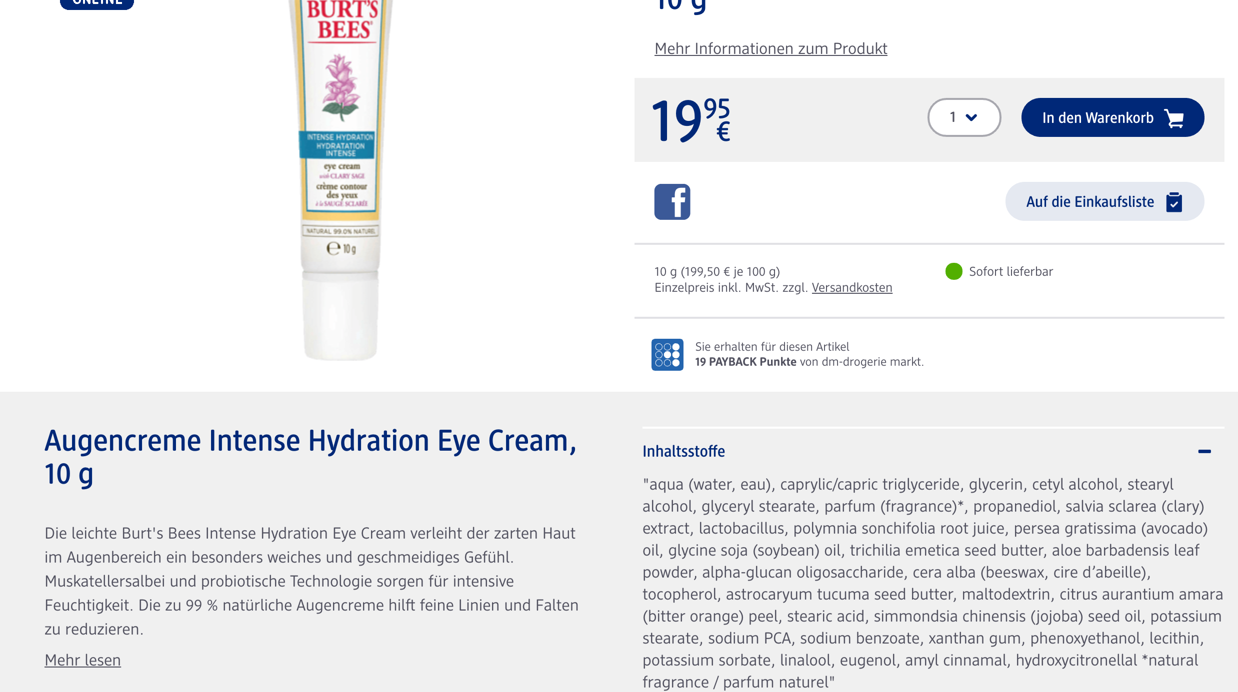 Diese Augenpflege von Burt´s Bees „besticht“ durch eine Menge Parfüm, weit vorne in der Zutatenliste, und dazu noch extra deklarationspflichtige Duftstoffe. Meiner Ansicht nach, sollte man in einem Augenpflegeprodukt besser auf Duftstoffe verzichten, denn Sicher ist sicher. Auch Zitrusextrakt gehört zu den potenziell reizenden Stoffen, und das finden wir hier ebenfalls. Die Augenpartie ist extrem dünn und empfindlich, da kann jedes „Zuviel“ eine unschöne Hautreaktion auslösen.