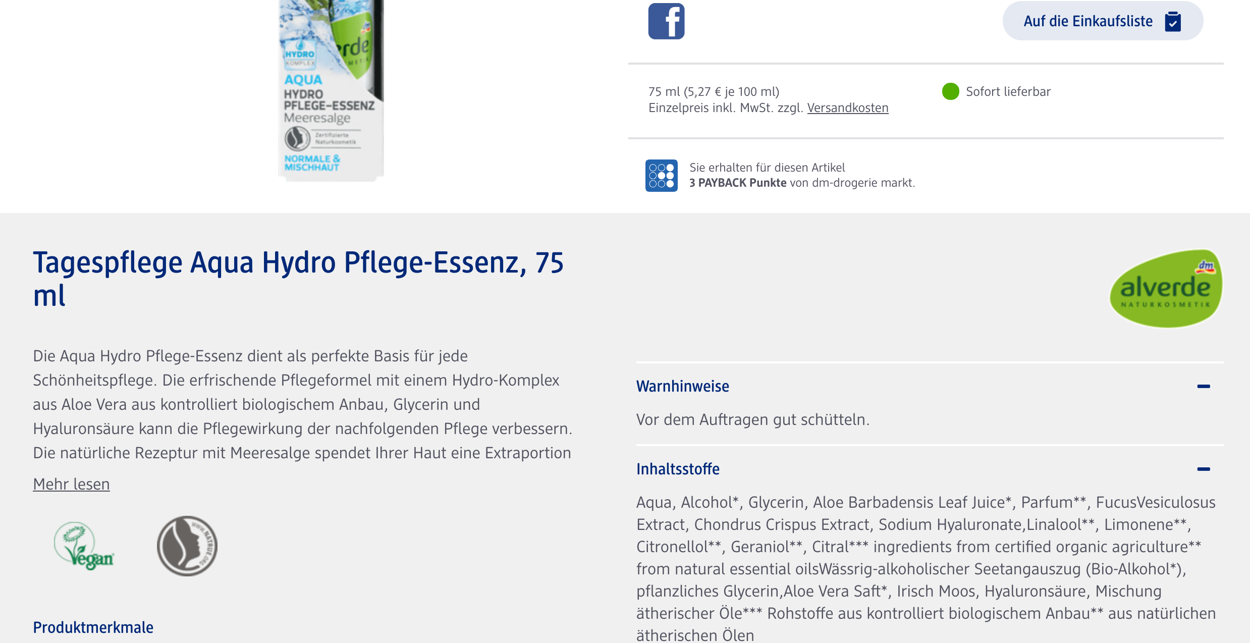 „Alverde“ (die „Biokosmetikmarke“ von DM) hüpft nun auch auf den Asia Trend und hat jetzt neu eine Aqua-Essenz im Programm. Alkohol gleich an 2. Stelle, Parfüm sodann schon an 5. Stelle. Die ätherischen Duftstoffe zahlreich. Was soll man da noch sagen? Unbedingt NICHT kaufen!