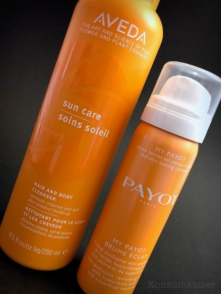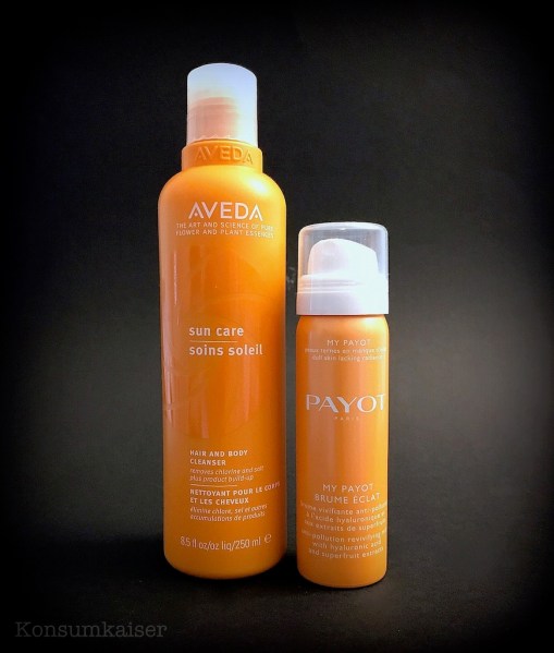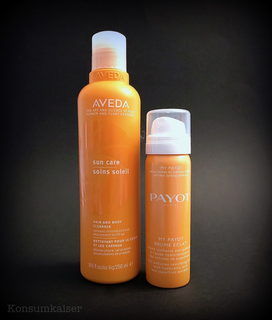 Trist und grau waren hier die letzten Tage, da bin ich für jeden Farbtupfer dankbar. Und wo funktioniert das besser als im Bad? Frische Farbe und frischer Duft, schon sind meine Lebensgeister deutlich gnädiger gestimmt. Deshalb heute ein After-Sun Shampoo/Duschgel von Aveda („Hair And Body Cleanser“) und ein Feuchtigkeitsspray von Payot („Brume Eclat“).