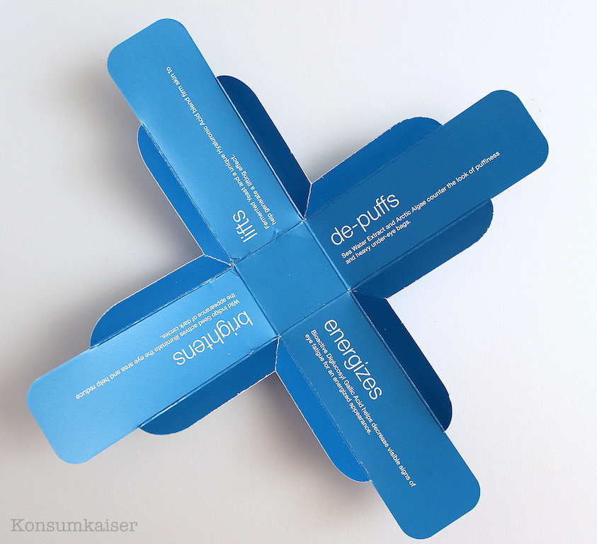 Ich bin mir nicht sicher, warum Firmen nicht über ihren Schatten springen, und zumindest in einem Augenpflegeprodukt den „Signatureduft“ weglassen können? Bei mir hatte es wahrscheinlich die Unverträglichkeit mit Knittereffekt verursacht, bei anderen womöglich auch mal ein geschwollenes Auge. Und das kann Tage später passieren. Dann schiebt man es auf die Kontaktlinsen, oder ähnliche Dinge. Trotzdem sind Duftstoffe – und besonders ätherische Öle, und sind sie auch noch so natürlich und bio – eine ganz schlechte Idee in einer Augenpflege.
