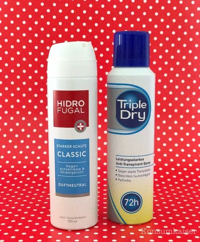 Nachdem so gut wie alle anderen parfümfreien Deos aus den Drogeriemärkten genommen wurden (es gab ein paar echt günstige und gut wirksame von Dove oder Garnier), bleibt scheinbar nur noch ein einziges, nicht duftendes Deodorant übrig: „Triple Dry“ (ca. 4 Euro).