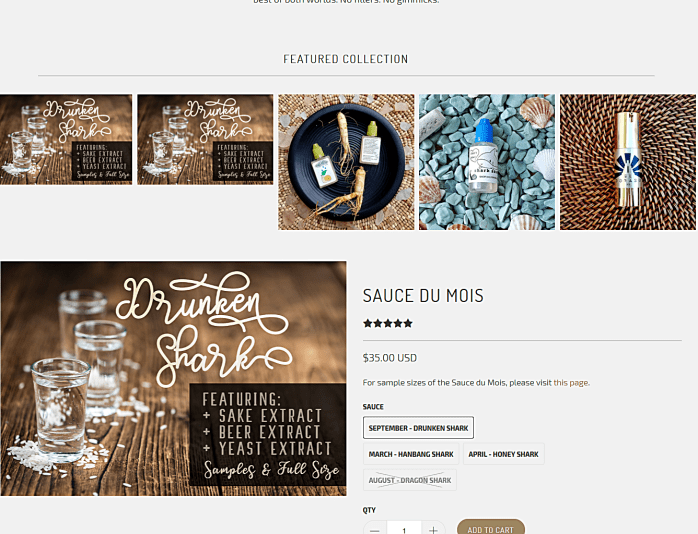 Sortiment: Es gibt sechs Produkte, außerdem regelmäßig „Limited Editions“. Von dem Serum Shark Sauce, das trotz des Namens keinen Hai enthält, gibt es als „Sauce du Mois“ jeden Monat eine zusätzliche Variante, aktuell „Drunken Shark“ mit Sake- und Hefe-Extrakt. Holy Snail Water (Serum), Snowbang Essence, Perseidis Facial Oil, El Dorado Vitamin C Oil und einen Lippenbalsam. Proben erhältlich (7 $)
