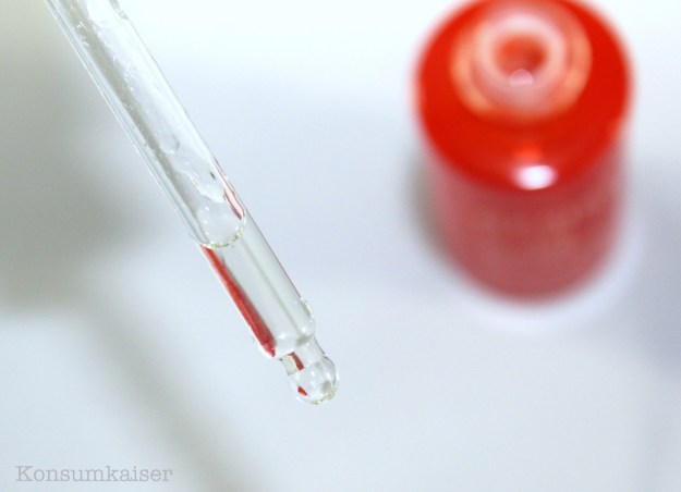 Gibt man das Serum unverdünnt auf die Haut, muss man wirklich aufpassen, denn es ist extrem wässrig. Es läuft schnell von der Hand. Wenn man den Booster mit einer Creme mischt, wird es einfacher.