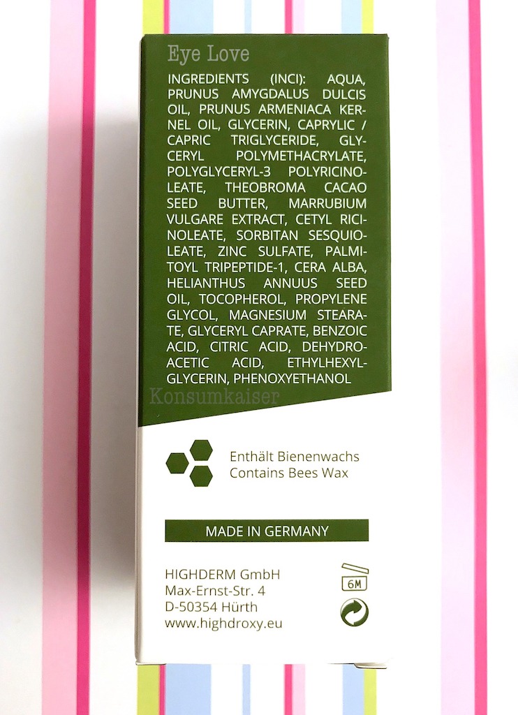 Eye Love ist allerdings typisch HighDroxy. Nicht irgendeine Augencreme, sozusagen die 5493. Pflege, die man sich unters Auge klatscht, sondern fast schon (zumindest in meinen Augen) ein Nischenprodukt.