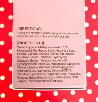 Mit Panthenol ist gleich zu Anfang der Inhaltsstoffe auch ein schön beruhigender Wirkstoff enthalten, neben einer Menge weiterer Feuchtigkeitsspender, einem Tri-Peptid, Chiasamen-Öl, Tigergras (Centella Asiatica), Extrakt der Chamäleonpflanze, usw.