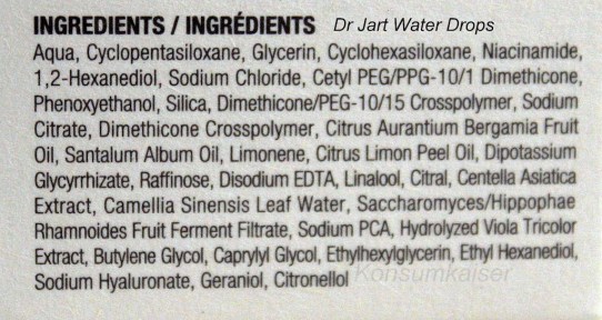 Wasser, Glycerin, eine feine Menge Niacinamid, und sehr viele Silikone findet man hauptsächlich in diesem Produkt. Silica sorgt für einen dezenten „Blur-Effekt“ auf der Haut, also ein optischer Weichzeichner, und für die angenehme Konsistenz. Ein paar Feuchtigkeitsspender noch (zB. Zucker, Hyaluron…) und dazu Centella Asiatica (Indischer Wassernabel oder Tigergras), Stiefmütterchenextrakt, Kamillenwasser, Sanddornfruchtfleischöl (fermentiert). Dazu gesellen sich jede Menge ätherische Duftöle, besonders aus dem Zitrusbreich, und Bergamotte Öl, die die Haut in der Sonne sensibilisieren, und braune Flecken verursachen können!