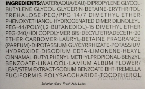 Meine Haut hat das Produkt bislang gut vertragen, ich habe keine Unverträglichkeiten bemerkt. Trotzdem hat mich das leicht „pelzige“ Gefühl nach dem Auftragen nach einer Zeit so gestört, dass ich das Gel nicht mehr verwenden wollte. Für mich muss eine Pflege nach dem Auftragen „weg“ sein, kaum noch spürbar, das leistet Shiseidos Jelly Lotion nicht.
