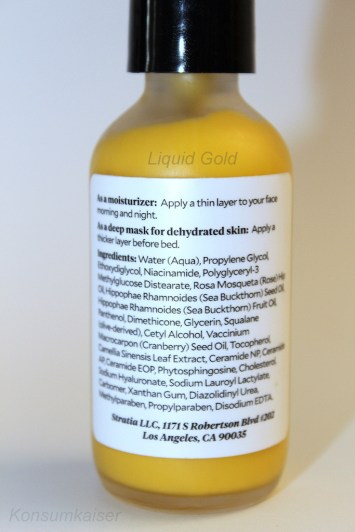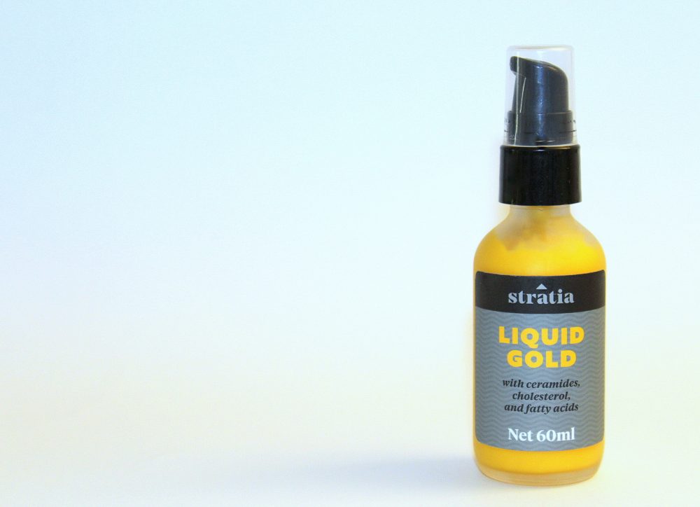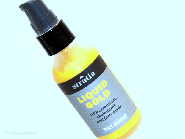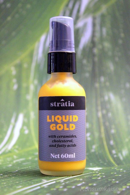 Dinah hatte vor ein paar Wochen über die kleine US Firma „Stratia“ berichtet, und ich war sogleich angetan. Spannende Produkte, gut zu lesende Formulierungen, das wollte ich dringend ausprobieren. So habe ich mir das „Kultprodukt“ Liquid Gold bestellt, welches durch Ceramide, Fettsäuren und andere Top-Inhaltsstoffe die Haut pflegt und die Hautbarriere reparieren soll. Mal sehen, ob der Hype gerechtfertigt ist…