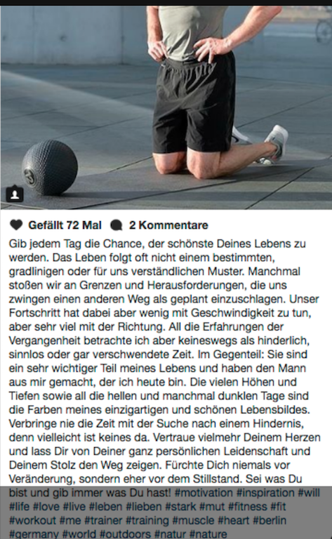 - Google den Trainer! Falls sein Internetauftritt nur so von eigenen Bildern und Weisheiten vom Kalenderblatt strotzt, sollte man misstrauisch werden. Hier lauert die Gefahr an einen „Poser“ zu geraten. Ich persönlich habe überhaupt keine Spuren im Internet, da für mich Diskretion das oberste Ziel ist, und dazu gehört, dass ich meine Person beruflich auf ein Minimum reduziere. Der Kunde ist wichtig, nicht ich! Ich brauche auch keine Werbeplattform, denn ein guter Trainer lebt von Empfehlungen. Wer als selbstständiger Trainer noch massenhaft Kapazitäten hat, ist entweder neu in der Branche, oder nicht wirklich empfehlenswert, so hart das auch klingt.