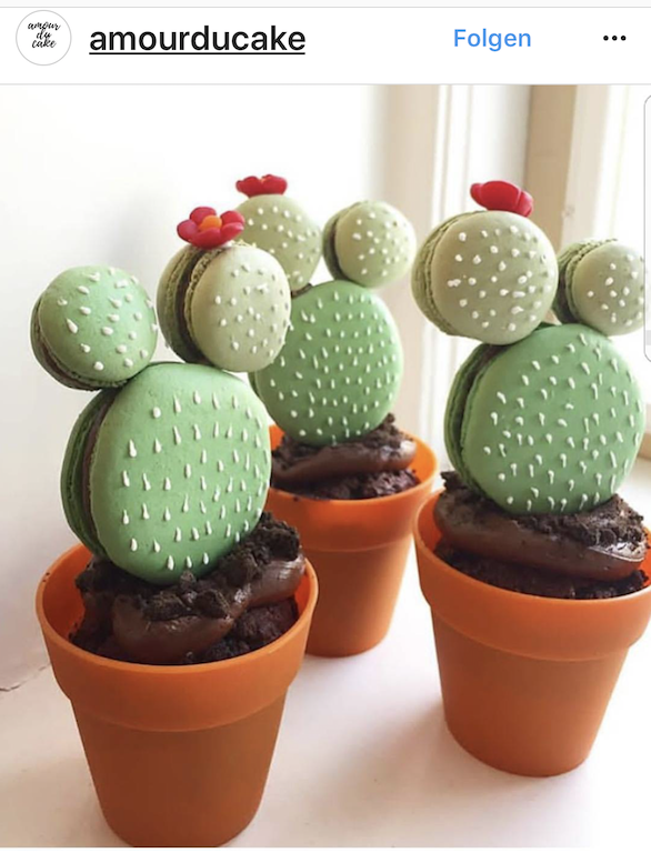 Dieses goldige Mitbringsel erfreut sicherlich jeden Beschenkten, und wenn es auch noch selbst gebastelt ist, wird die Freude noch größer sein. Dazu braucht man einfach ein kleines Gefäß, etwas Tassenkuchen, ein paar grüne Macarons, und Zuckerguss für die kleinen „Stacheln“. Eine kleine Blüte aus Marzipan oder Zucker gibt es bei den Backzutaten. Wirklich goldig!