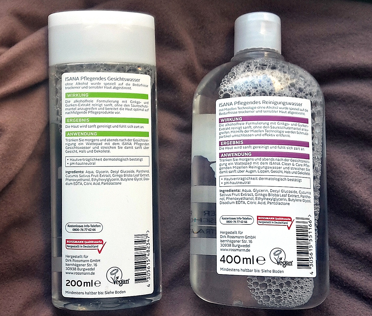 Da Mizellen der neue Beauty-Trend sind, lauern sie neuerdings übrigens überall. Ein gutes Beispiel sind das Mizellen- und das Gesichtswasser von Isana, der Rossmann-Eigenmarke. Was ist nun der Unterschied? Das Mizellenwasser reinigt, das Gesichtswasser nicht? Falsch. Beide enthalten an 3. Stelle der INCI Decyl Glucoside, ein mildes Zuckertensid. Der Unterschied: Das Gesichtswasser enthält etwas mehr Panthenol und ist günstiger, berechnet auf 100 ml. Die Formulierung mag an sich gut sein, allerdings werde ich auch dieses Gesichtswasser nur zum Abschminken benutzen.