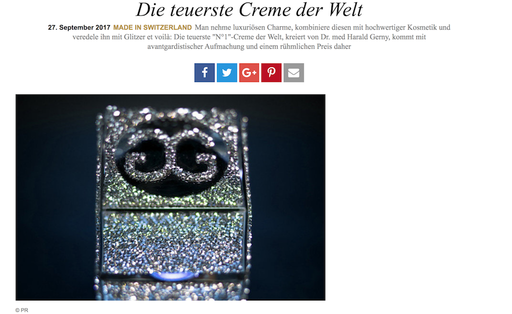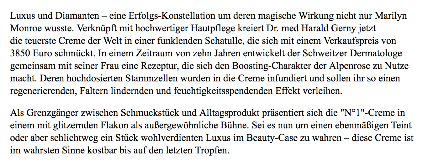 Die teuerste Creme der Welt. DAS ist natürlich ein Attribut, das bei einigen Zeitgenossen einen sofortigen Haben-will Reflex auslösen dürfte. Die MUSS ja wirken…wie die Hölle, oder? Ich meine für 3850,00 Euro kann man doch wohl was erwarten. Und da sie auch noch aus der Schweiz kommt und von einem waschechten Quacksalber Arzt (Dr. Harald Gerny) „erfunden“ wurde, konnten doch wohl alle Zweifel beseitigt werden?