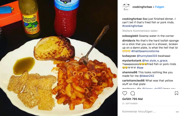 PS: ich hab mir gerade mal auf Twitter „Cooking for bae“ angesehen. Das ist schon auf erwarteten Schock gemacht und ich habe gerade herzlich über die Kommentare gelacht (OMG!) kennst du den Typen, der das macht? Klingt wie ein Brite, denen macht es Spaß, sich selbst zum Heiterkeitsobjekt zu machen und ich finde das super charmant. Foodhorror wird Trend – und wir alle essen weniger, feiern dafür den Typen. Ich folge ihm jetzt auch.