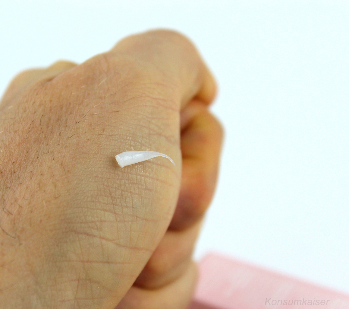 Zuerst war ich ein wenig enttäuscht, denn die kleine Lippenpflege kommt total unscheinbar daher und fühlt sich an wie viele der Lippenpflegeprodukte: Dick und pampig, leicht schmierig und etwas glänzend auf den Lippen. Petrolatum ist die Grundlage, also Vaseline, nicht Wasser (das ist nicht enthalten). Klar, die Konsistenz ist also geklärt.