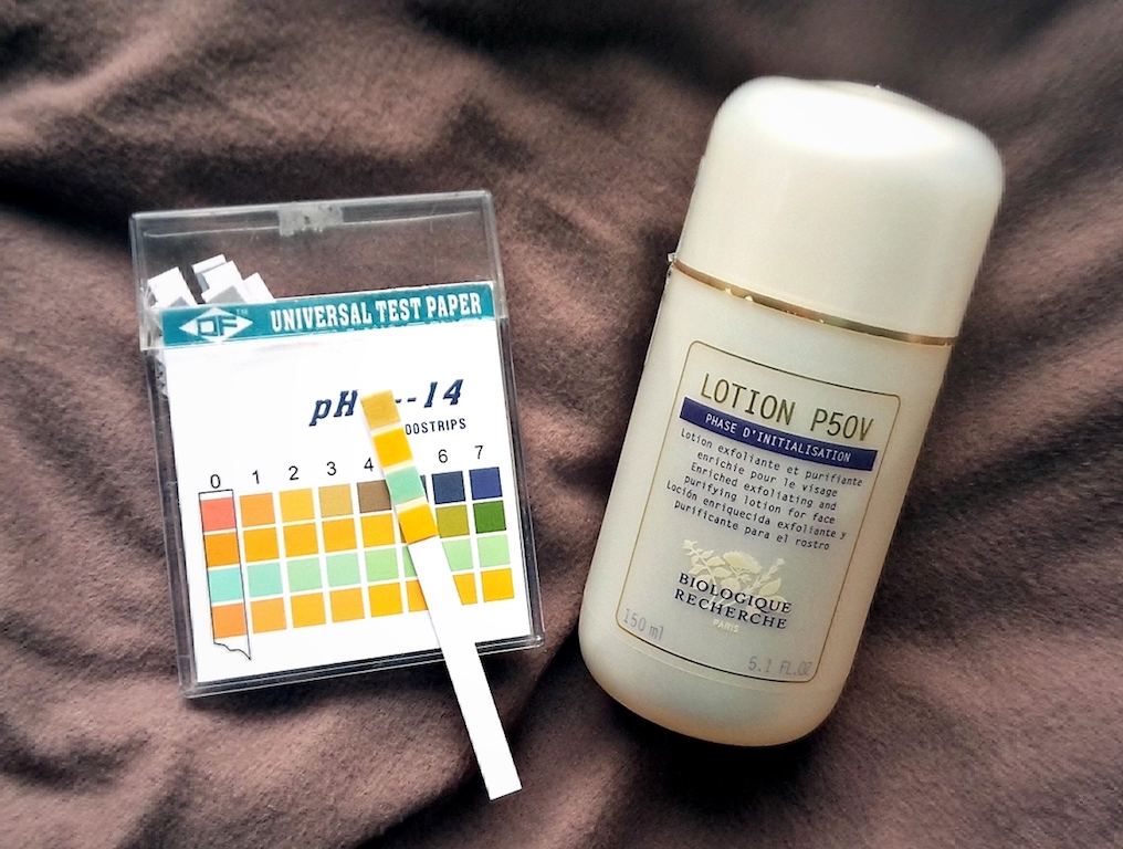 Da es hier in den Kommentaren mehrfach erwähnt wurde – die Versionen P50 und P50V sind nicht die Produkte, mit denen man anfangen sollte, wenn man zum ersten Mal etwas bei Biologique Recherche bestellt! Es sei denn, man hat wie ich bereits Erfahrung mit professionellen chemischen Peelings, die noch deutlich stärker sind. Die Originalversion P50 aus dem Jahr 1970 ist in Europa nicht mehr im Handel. Die jetzige Lotion P50 kam im Jahr 2000 auf den Markt. Und weil sie für viele zu stark ist, gibt es die Version P50W und auch P50 400 Pigm und diese werden von BR selbst ausdrücklich als milde Alternative empfohlen. Wer neugierig auf dieses Zeug ist, sollte sich eine kleine Größe davon bestellen. Die Tatsache, dass jemand schon länger problemlos andere AHA Peelings wie die von Paulas Choice benutzt, sagt wenig aus. Es kommt nämlich darauf an, wie viel freie Säure bei einem Produkt wirkt. Und das steht nicht drauf, das muss man berechnen. Die meisten Peelings bei PC und anderen Herstellern haben einen ph-Wert von etwa 4,0. Das heißt, dass von 10% Säure gerade mal noch 4% Säure auf der Haut wirken. Bei P50 mit einem ph-Wert von 2,4 sind es fast 13% freie Säure – da liegen Welten dazwischen! Natürlich kann man da nicht einfach so wechseln und von einem „sauren Toner“ kann keine Rede sein. Das ist ein Treatment, das ursprünglich zur Behandlung von Akne entwickelt wurde.