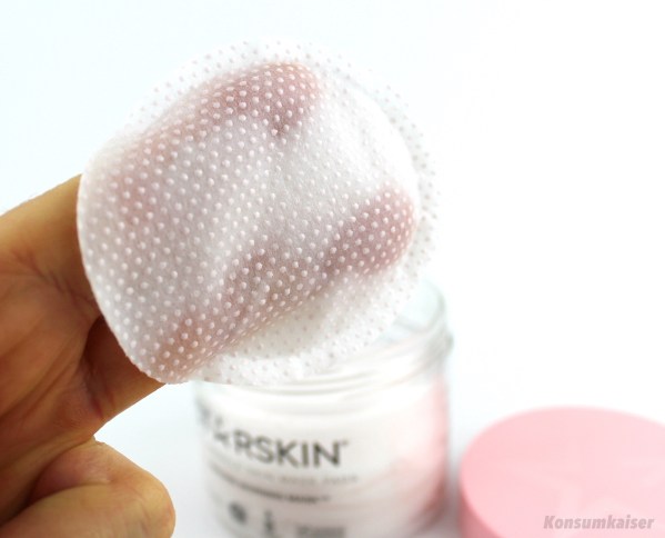 Nachdem man mehrfach mit beiden Padseiten über das Gesicht gestrichen hat, liegt ein feuchter Film auf der Haut, der erst nach Minuten wegzieht. Er trocknet eher, als dass er einzieht. SEHR unangenehm!