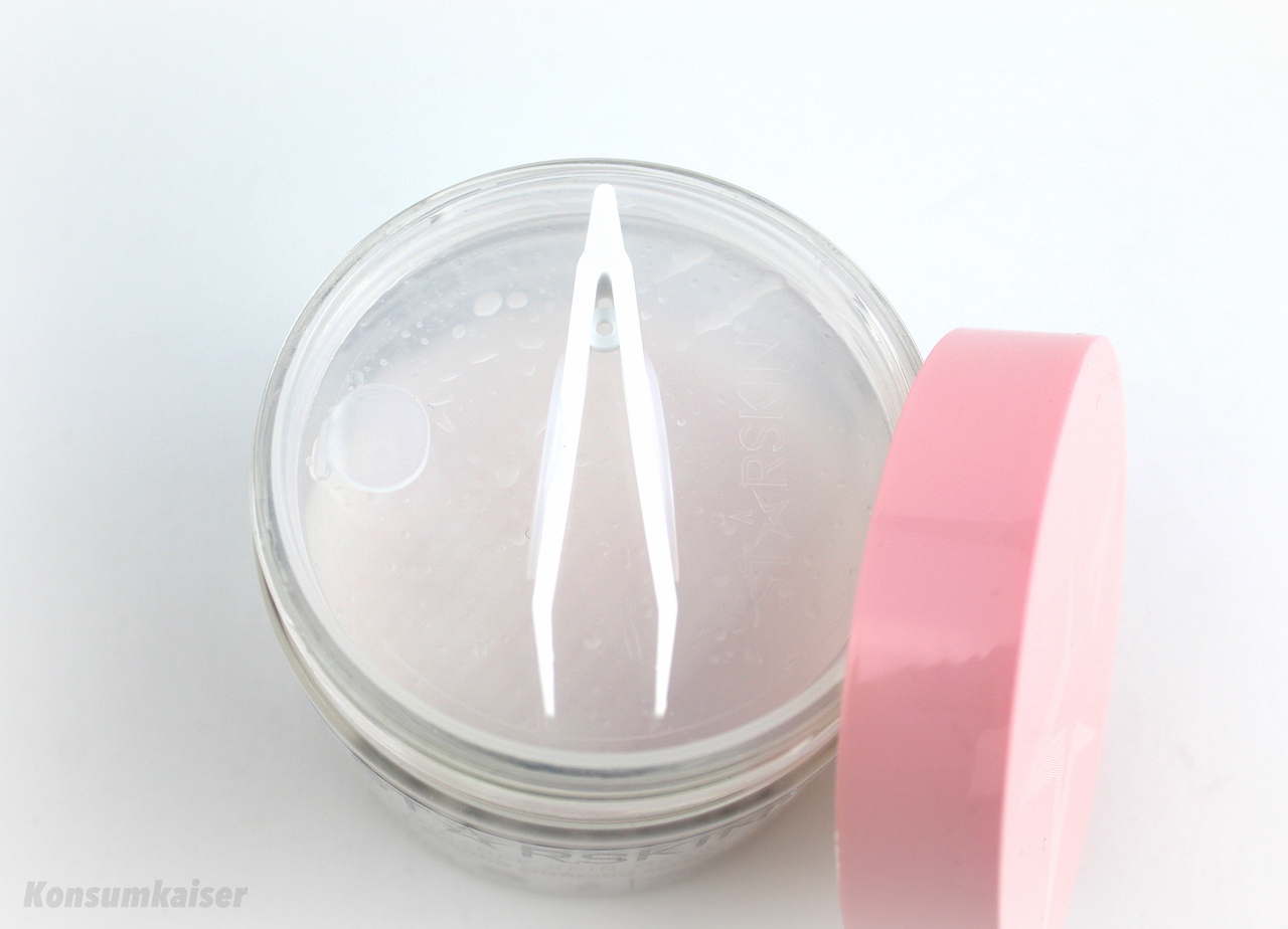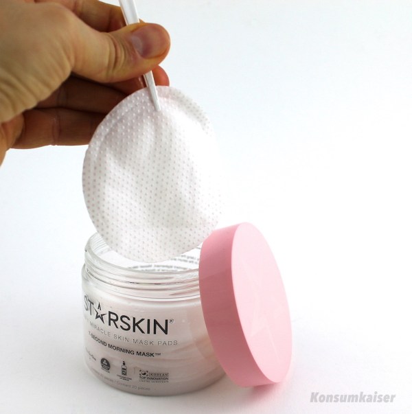 Nee, das klappt nicht! Mit 7 Sekunden ist man hier definitiv nicht dabei, egal wie man es anstellt. Zuerst: Das Gesicht waschen (ah ja, 7-Sekunden – schon für die Katz). Das Herauspulen eines Pads mit der beigelegten Plastikzange dauert dann nochmals doppelt so lange. Danach hantiert man mit dem mit Serum über-tränkten Pad. Man steckt zwei Finger hinein, damit wird übers Gesicht gestrichen. Wenn überhaupt: Bitte vorsichtig, das ist ein mechanisches Peeling, und wenn man etwas mehr drückt, wird die Haut deutlich (!) gereizt. Das sollte man sich sparen.