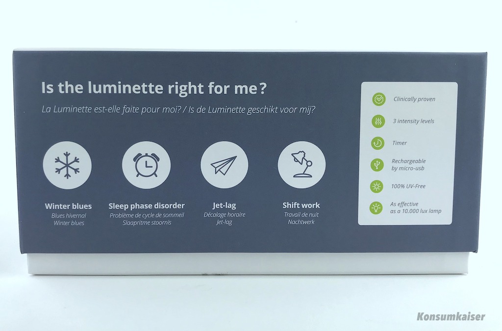 Etwas Recherche und ich sah die Luminette. Einfach aufsetzen und mit Helligkeit bestrahlt werden, dabei aber relativ frei und ungebunden sein (zumindest in der Wohnung) – das klingt perfekt! Beim Preis wurde mir zwar ein wenig blümerant zumute (ca. 199 Euro), aber schlussendlich habe ich sie mir bestellt, und vier Tage später kam sie per DHL ins Haus.