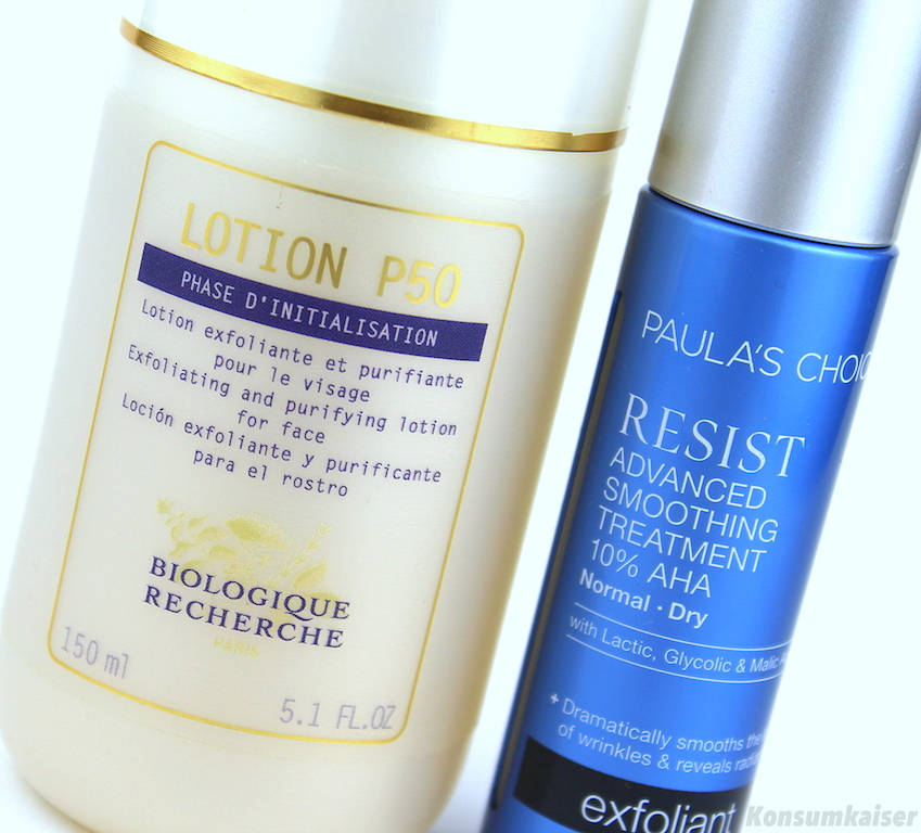 Über die beiden Säurepeelings, um die es heute geht, wurde bereits viel geschrieben. Wird Zeit, dass ich auch meinen Senf dazu gebe. Von Biologique Recherche habe ich die legendäre „Lotion P50“ und von Paula´s Choice das „Resist – Advanced Smoothing Treatment 10% AHA“ ausprobiert. Zwei Produkte, die unterschiedlicher nicht sein können. Trotzdem sind sie beide….na, lest selbst…!