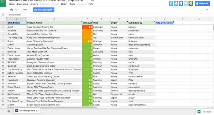 Im Internet (in einem reddit Forum) habe ich eine interessante Zusammenstellung vieler K-Beauty Reinigungsprodukte samt pH Wert gefunden, die ich allen Asiabeautyfans ans Herz legen möchte. Es sind ja enorm viele Produkte zu finden, die sich im Bereich deutlich über pH 9 tummeln, u.a. auch von Shiseido. Hmmm.