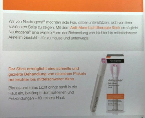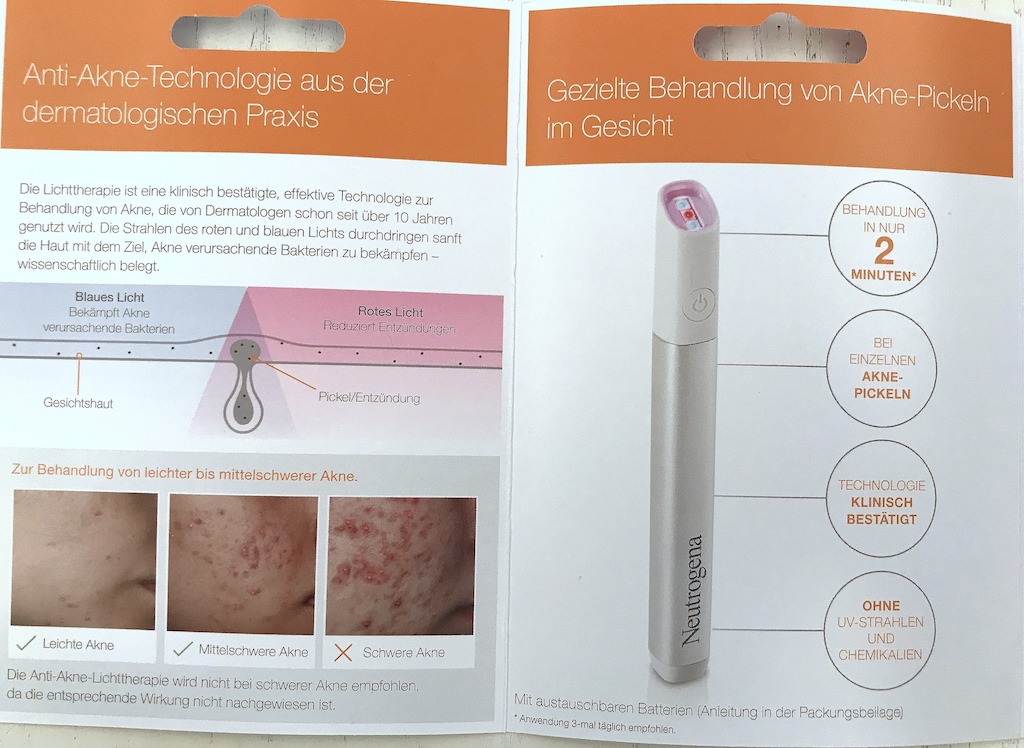 Neutrogena bietet ja auch in Drogeriemärkte eine (deutlich günstigere, ca. € 50,-) Lichtmaske gegen Hautunreinheiten an. Und nun gibt es das Verfahren auch für unterwegs, als „Lichttherapie Stick“