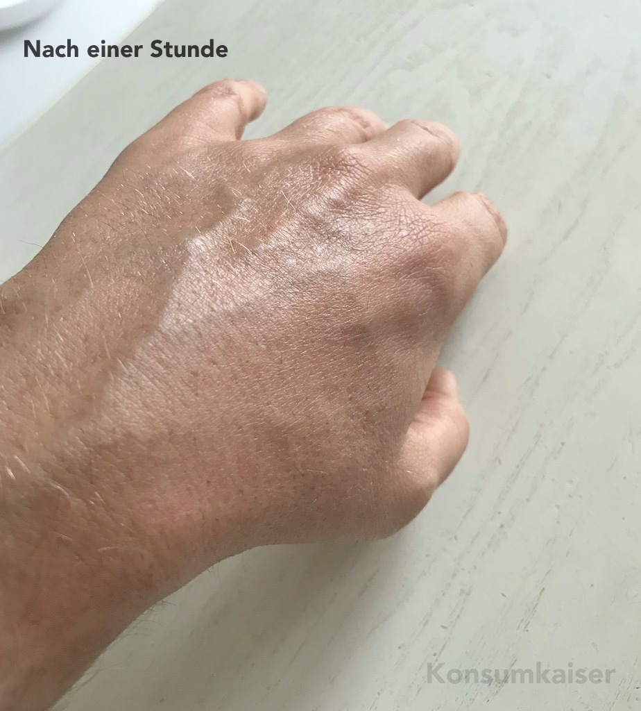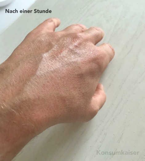 Aus Zufall schaute ich dann eine Stunde nach der Fotosession nochmals auf die Hand und war erstaunt, dass die schlimme Reizung vollständig abgeklungen war. Dabei sah die Haut prall und gut mit Feuchtigkeit versorgt aus! Das musste ich schnell mit dem Handy fotografieren: