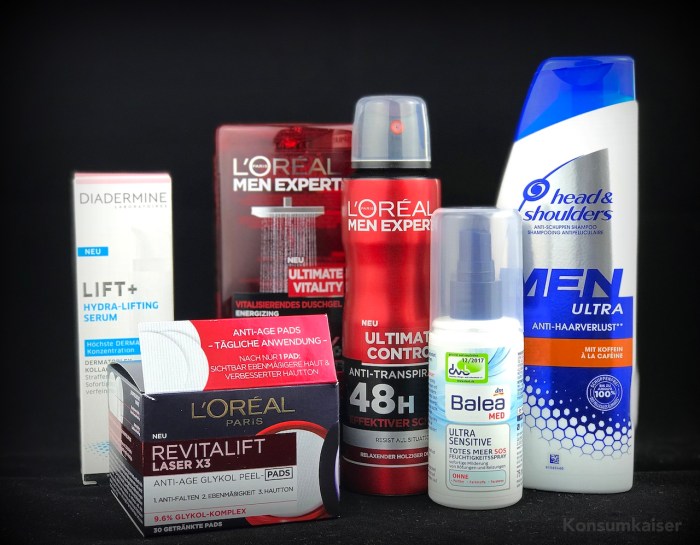 Auch bei den Herren gibt es drei neue Hautpflegeprodukte (Serum, Creme, Augenpflege), die ebenfalls den unguten Alkohol weit vorne führen. Also nichts Neues im L´Oreal Universum.