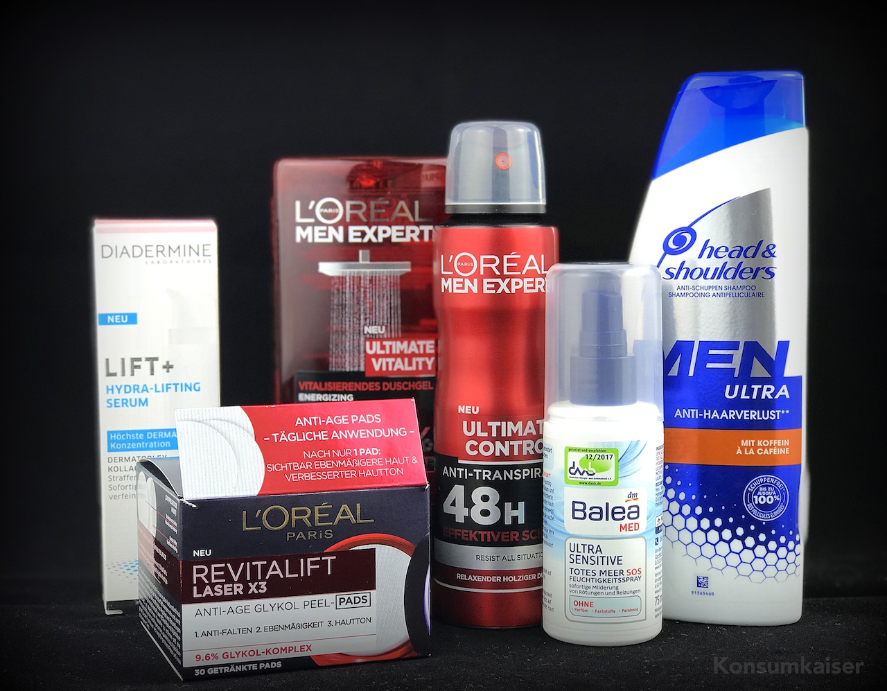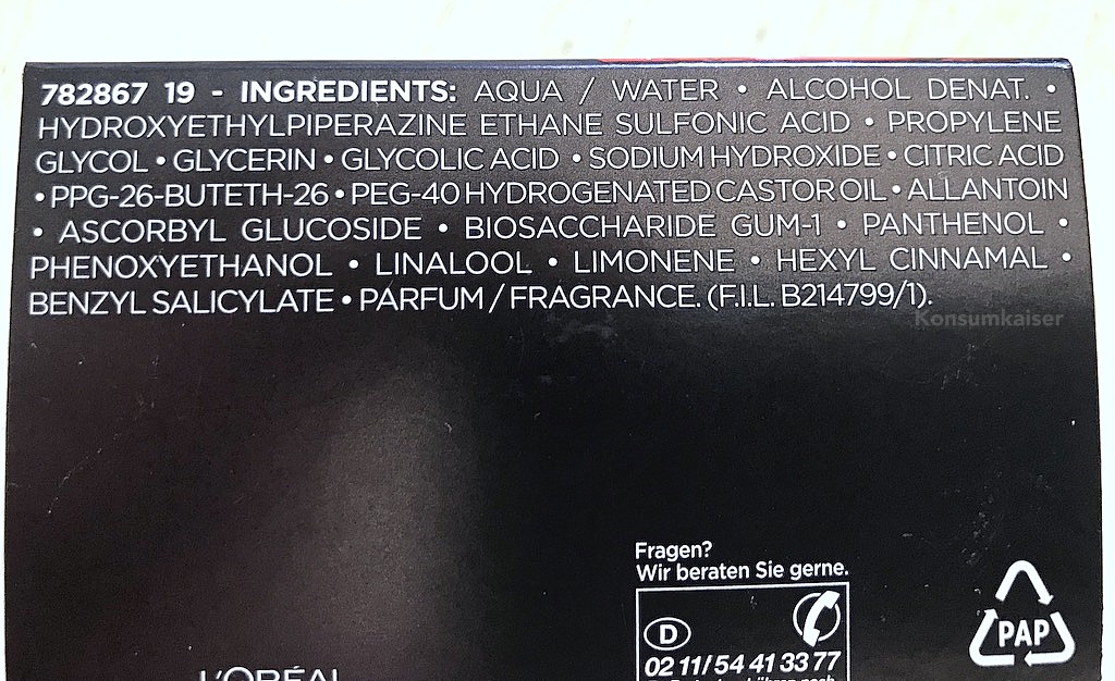 Auch bei den Herren gibt es drei neue Hautpflegeprodukte (Serum, Creme, Augenpflege), die ebenfalls den unguten Alkohol weit vorne führen. Also nichts Neues im L´Oreal Universum.