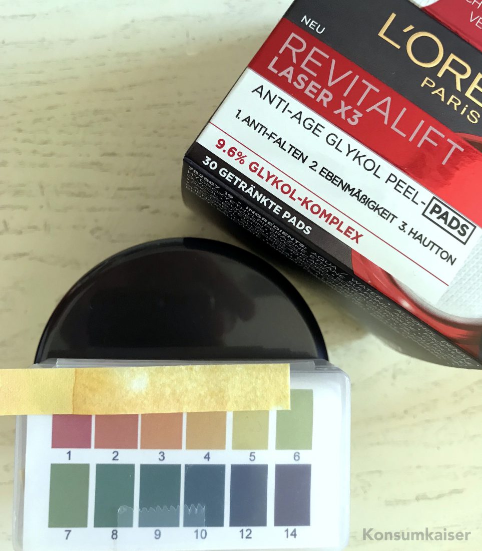 Dabei könnte das Produkt OK sein: Ausnahmsweise stimmt nämlich mal der pH-Wert der Peelingpads. Er liegt nach meiner Messung deutlich unter pH 4, was die Säure ganz gut arbeiten lässt. Trotzdem ist der Gehalt an freier Säure recht gering, es reicht als Anfängerpeeling aus.