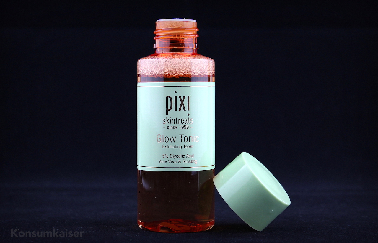 „Das Glow Tonic von Pixi hilft, die Haut zu straffen und entfernt abgestorbene Hautzellen. Mit Ginseng, Aloe Vera, Fruktose und 5 % Glycolsäure wird die Haut zum Strahlen gebracht. Alkoholfrei. Für alle Hauttypen geeignet.“