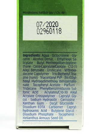 Eine weitere Version der neuen Sun Dance Gesichtssonnenschutzcremes. Hier findet sich der vergällte Alkohol gleich als zweiter Inhaltsstoff nach Wasser. Das ist mir doch etwas viel, schade eigentlich, es handelt sich doch um ein Anti-Aging Produkt. Die gemischten Filter sind ok, der mineralische Schutz (Titandioxid) weisselt ein wenig stärker als bei der Anti-Pollution Version, aber es ist erträglich. Der Duft ist gleich zum grünen Produkt, leider. Aber das ist wirklich nur mein subjektives Empfinden. Die Anti-Aging Version enttäuscht mich ein wenig. Auch in LSF 50 erhältlich (50 ml ca. € 3,95)