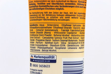 Sonnenpflege im Spender, prima. Sun Dance von DM hat eine neue Sonnenschutzserie für das Gesicht im Programm. Gute UV Filterkombi. Leider auch Alkohol, allerdings nach einem Filter und nach dem Glycerin. Die Menge des reizenden Stoffs ist also nicht all zu hoch und dürfte die Haut nicht übermäßig belästigen. Die weiche Creme ist fluidartig, etwas reichhaltiger als gedacht und weisselt kaum. Gut verrieben sieht man nichts mehr. Der Duft ist eher warm und schwülstig, etwas Frischeres wäre mir für ein Sonnenpflegeprodukt lieber gewesen, oder besser: gar kein Duft. Aber das ist ja immer noch illusorisch „Die Kunden verlangen es so!“ Der erste Eindruck war jedenfalls positiv. Auch in LSF 50 erhältlich (50 ml ca. € 3,95)