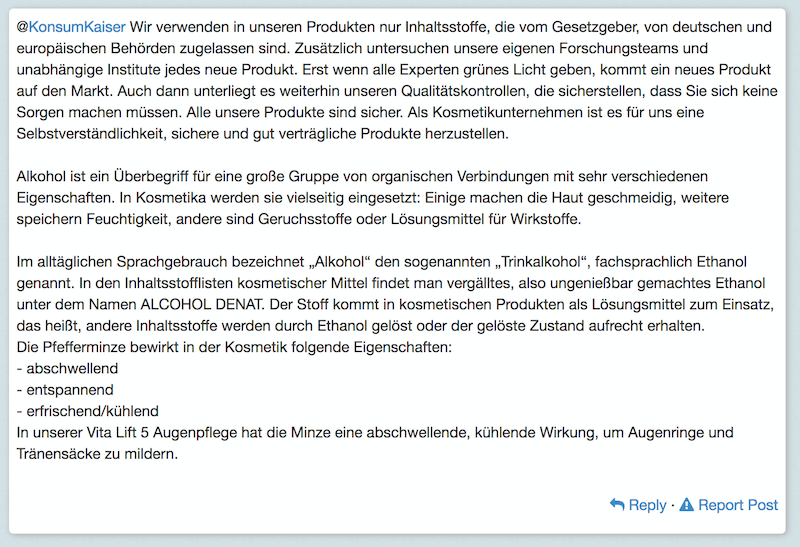 Schön zu sehen ist allerdings die Antwort von L´Oréal, die zeigt wie sehr das Wohl der Kunden dieser Firma am Herzen liegt…oder so. Mit einer Standardantwort versuchte man sich herauszureden. Natürlich ist es erlaubt Alkohol denat. in Pflegeprodukten zu verwenden, und ätherische Öle sind ja auch per se nichts Schlechtes…aber in einem Augenpflegeprodukt, ich bitte sie, liebe Social Media Experten von L´Oréal.