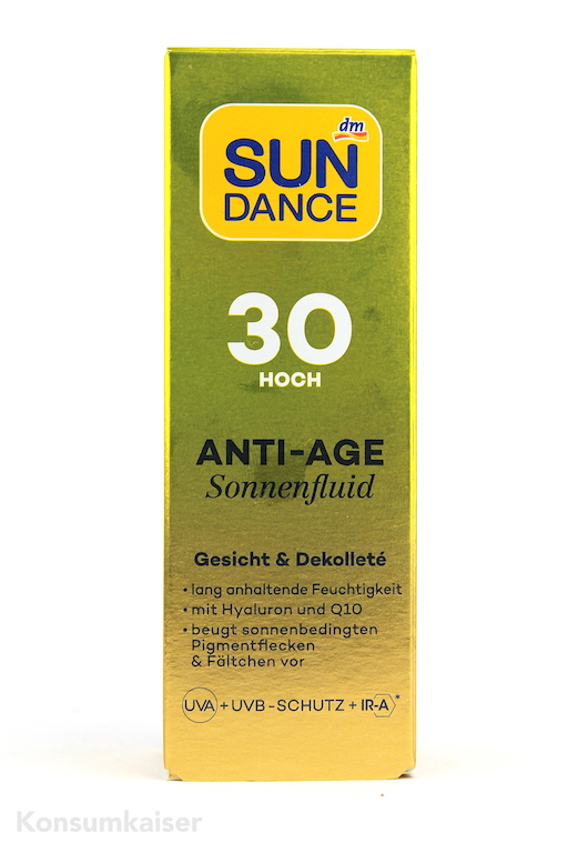 Eine weitere Version der neuen Sun Dance Gesichtssonnenschutzcremes. Hier findet sich der vergällte Alkohol gleich als zweiter Inhaltsstoff nach Wasser. Das ist mir doch etwas viel, schade eigentlich, es handelt sich doch um ein Anti-Aging Produkt. Die gemischten Filter sind ok, der mineralische Schutz (Titandioxid) weisselt ein wenig stärker als bei der Anti-Pollution Version, aber es ist erträglich. Der Duft ist gleich zum grünen Produkt, leider. Aber das ist wirklich nur mein subjektives Empfinden. Die Anti-Aging Version enttäuscht mich ein wenig. Auch in LSF 50 erhältlich (50 ml ca. € 3,95)