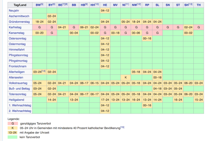 Schau mal in die Grafik, da wundert man sich, wann und wo es in Deutschland sonst noch Tanzverbote gibt.