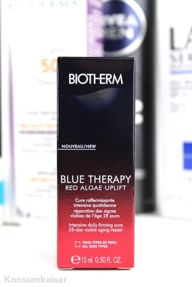 Starten wir mit dem neuen Blue Therapy Red Algae Uplift Serum von Biotherm. Ein sehr flüssiges Serum, das angeblich noch tiefer in die Haut eindringen kann, um dort seine Anti-Aging Wirkung zu entfalten. Die Algen sind schon mal super, böser Alkohol ist (oh Wunder) diesmal keiner enthalten, nur die Wirkstoffmengen (auch der Konservierer) machen mir ein wenig Sorge. Ich bin gespannt. 15 ml kosten ca. € 31,00 (zB. Parfumdreams)