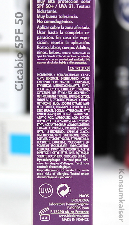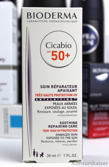 Bioderma hat mit der Cicabio SPF 50 eine reparierende (und leicht antibakteriell wirkende – durch Kuper/Zink) Sonnencreme, die viel Feuchtigkeit spendet, auch trockene Haut zufriedenstellen kann und nicht weisselt (chmische Filterkombi). Der Lichtschutzfaktor beträgt für UVB 50, für UVA liegt er bei 31. Madecassoside der Centella Asiatica sind ebenso enthalten wie Hyaluron. Duftstoffe sucht man zum Glück vergeblich. Für ölige und Mischhaut ist das Produkt aber wahrscheinlich wieder einmal zu reichhaltig, obwohl es nicht besonders cremig wirkt. Vielleicht einmal ausprobieren? 30 ml ca. € 10,00 – in Apotheken