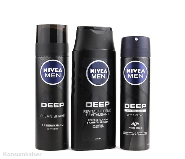 Nivea hat eine neue Serie für Männer herausgebracht: „Deep“ kommt in tiefschwarzen Behältern mit Carboneffekt. Das sieht tatsächlich mal schick aus, ich habe mir sofort das Shampoo (super!), der Rasierschaum (ebenfalls sehr gut!) und das Deospray (nice) gekauft. Der Duft ist etwas schwülstiger als die sonstigen Nivea-Düfte, aber man kann es ertragen. Das Shampoo duftet leider besonders stark, dabei macht es wunderbar frische Haare. Das Deo duftet dagegen (seltsam) deutlich weniger stark und aufdringlich und schützt prima vor Achselnässe und Geruch. Der Rasierschaum ist ebenfalls nicht so stark parfümiert, macht einen guten Job, da kann man nicht meckern. In dieser Produktgattung hat es Nivea durchaus drauf, bei Cremes bin ich da schon deutlich skeptischer! Deo ca. € 1,75, Shampoo ca. € 2,50, Rasierschaum ca. € 2,00 – In Drogerien und Kaufhäusern